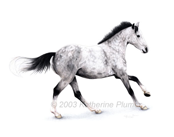 What a fun one this was! We originally were planning on having me do a head portrait with Hot Shot in his bridle. So I shot a roll of head photos, and none turned out all that flattering. Hot Shot is one of those ponies that just doesn't have the world's most beautiful profile. So I went back and retook them from a different angle, focusing more on a 3/4 head shot, and at the end I had a few shots left on the roll so we turned him loose in the arena, and I got the photo on which I based this drawing. Out of all that I took, it was the one that just completely captured his (bratty!) attitude. While this may look like a black and white drawing, there are actually over 30 colors that I used, and surprisingly most of them are in the "white" socks! It is such a pale and subtle drawing that no scan can do it justice! This is one of those drawings that practically drew itself.