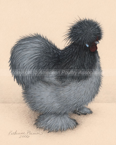TITLE: "Bantam Non Bearded Blue Silkies" DATE: 2006, © American Poultry Association SIZE: 8 by 10 inches each MEDIUM: colored pencil, graphite, watercolor, and ink; on tan Rising Stonehenge paper PRICE: sold, collection of J.Brett, Massachusetts, USA (male illustration) and D.Wake, California, USA (female illustration)