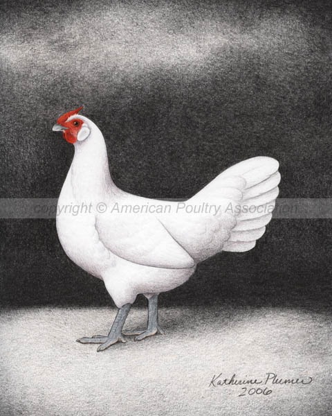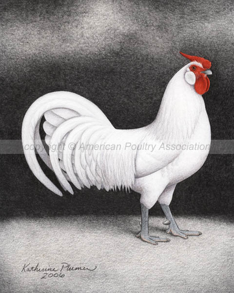 TITLE: "Bantam White Hamburgs" DATE: 2006, © American Poultry Association SIZE: 8 by 10 inches each MEDIUM: colored pencil, graphite, and ink; on white Rising Stonehenge paper PRICE: sold, collection of J.Legendre, Oregon, USA (male illustration) and G.Agajanian, California, USA (female illustration)