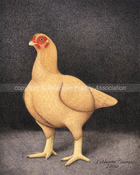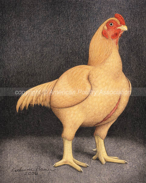 TITLE: "Large Buff Cornish" DATE: 2006, © American Poultry Association SIZE: 8 by 10 inches each MEDIUM: colored pencil, graphite, and ink; on tan Rising Stonehenge paper PRICE: sold, collection of R.Jones, California, USA (male illustration) and W.Leonard, California, USA (female illustration)