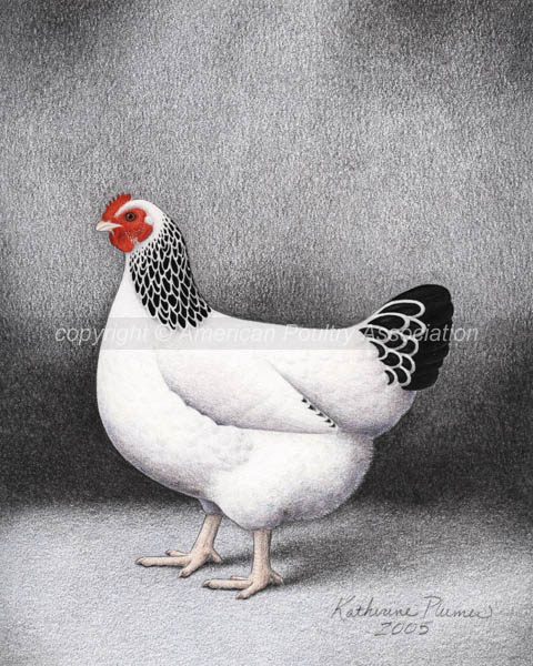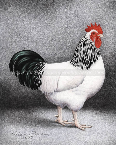 TITLE: "Large Light Sussex" DATE: 2005, © American Poultry Association SIZE: 8 by 10 inches each MEDIUM: colored pencil, graphite, and ink; on white Rising Stonehenge paper PRICE: sold, collection of D.Misener, Ontario, Canada