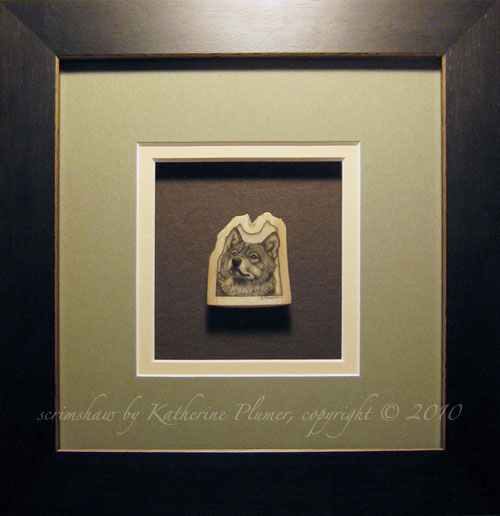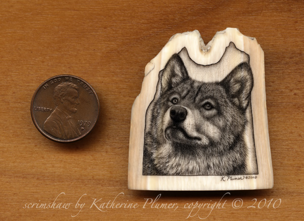 TITLE: "Catching the Scent" (Wolf) DATE: © 2010 SIZE: approx 1-5/8 by 1-3/4 inches (40x45mm) MEDIUM: scrimshaw engraving on pre-ban elephant ivory PRICE: sold, collection of A.King, Texas, USA