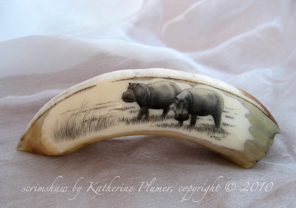TITLE: "Hippos" DATE: © 2010 SIZE: whole tusk is 3.5 inches long MEDIUM: scrimshaw engraving on hippo tooth ivory PRICE: sold, collection of J.Daffron, Tennessee, USA (commission) BACK TO SCRIMSHAW FINE ART