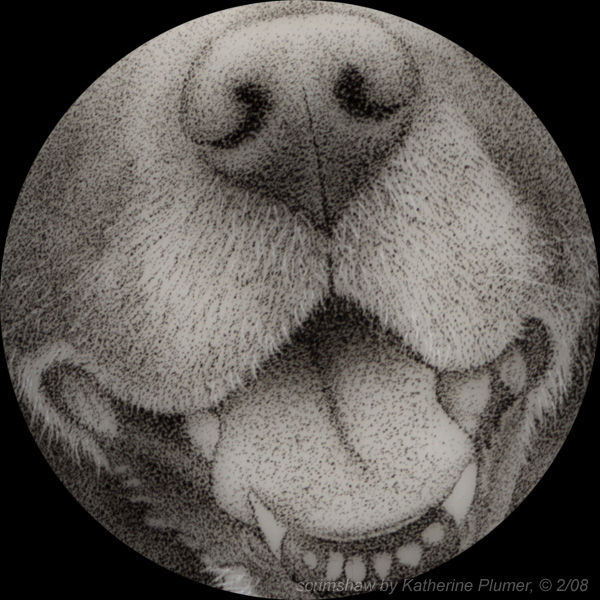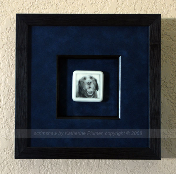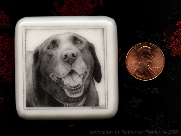 TITLE: "Jessie" DATE: © 2008 SIZE: 2 by 2 inches MEDIUM: scrimshaw engraving on Corian PRICE: not for sale, collection of the artist