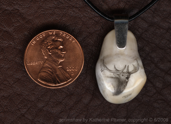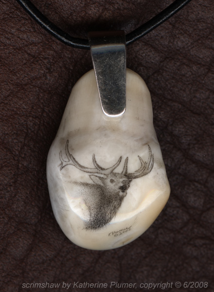TITLE: bull elk pendant DATE: © 2008 SIZE: ~5/8 by 7/8 inches MEDIUM: scrimshaw engraving on ivory elk tooth (yes, it's really an elk tooth!) PRICE: not for sale, I decided to keep it :-) Thank you Bryan K. for the teeth!