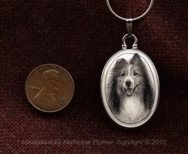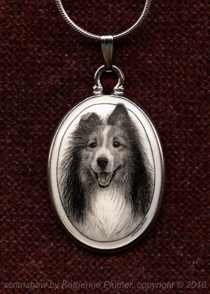 TITLE: "Trevor" (Shetland Sheep Dog) pendant DATE: © 2010 SIZE: 22 by 30 millimeters MEDIUM: scrimshaw engraving on pre-ban elephant ivory PRICE: sold, collection of K.Eden, New Hampshire, USA (custom commission)