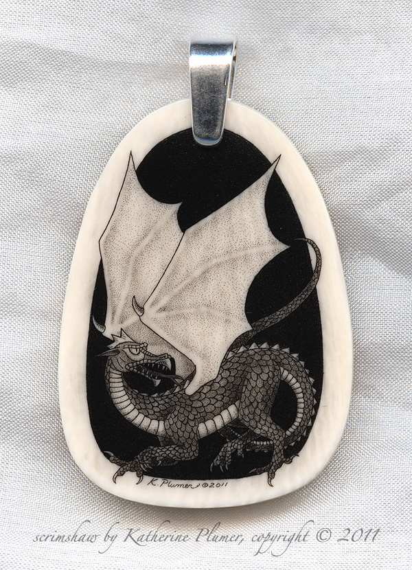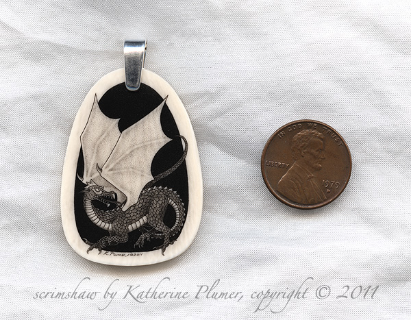 TITLE: Dragon pendant DATE: © 2011 SIZE: 1-3/16 by 1-5/8 inches (30 by 42 mm) MEDIUM: scrimshaw engraving on pre-ban elephant ivory PRICE: sold, collection of A.Chewiwi, New Mexico, USA
