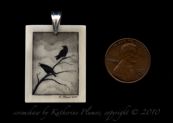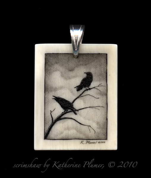 TITLE: "Ravens" pendant DATE: © 2010 SIZE: 1 by 1.25 inches (1/16 inch thick) MEDIUM: scrimshaw engraving on pre-ban elephant ivory PRICE: sold, collection of R.VanOstrand, New York, USA