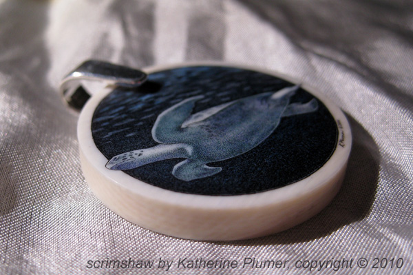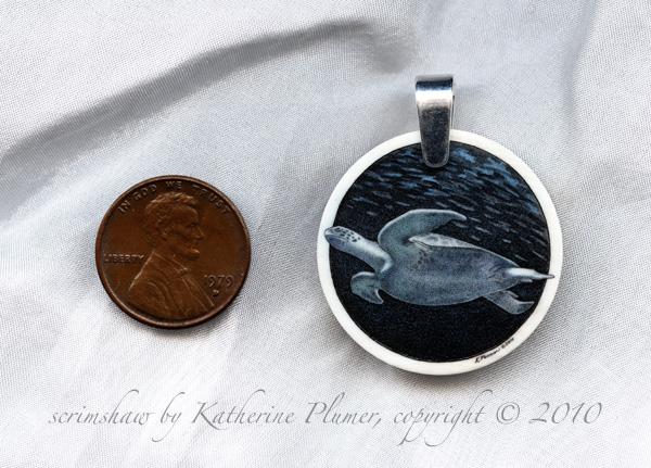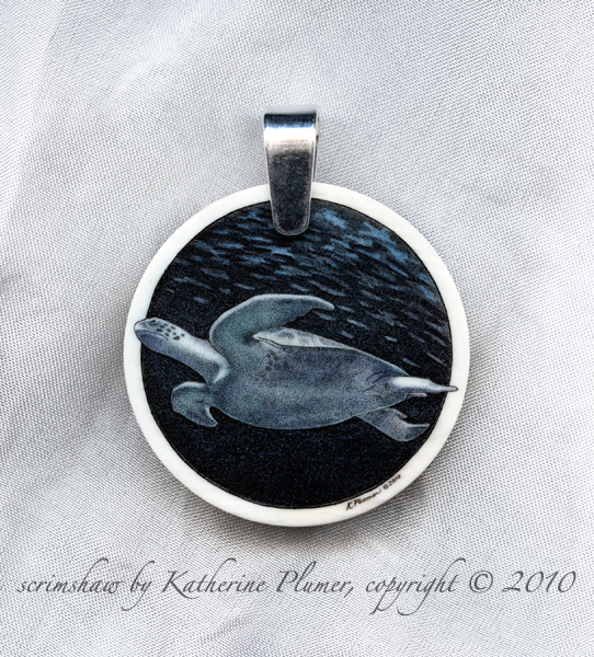 TITLE: "Green Sea Turtle" pendant DATE: © 2010 SIZE: 30 millimeters diameter, 4 millimeters thick MEDIUM: multicolor scrimshaw engraving on pre-ban elephant ivory PRICE: sold, collection of J.Rubio, Hawaii, USA