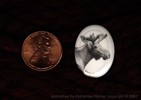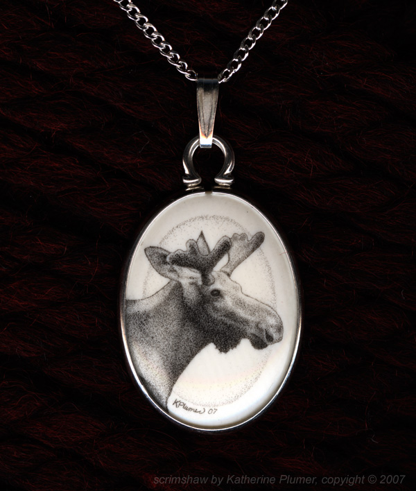 TITLE: moose pendant DATE: © 2007 SIZE: 18 by 25 millimeters MEDIUM: scrimshaw engraving on pre-ban elephant ivory PRICE: collection of L.Plumer, California, USA