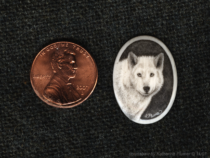 TITLE: white wolf pendant DATE: © 2007 SIZE: 18 by 25 millimeters MEDIUM: scrimshaw engraving on pre-ban elephant ivory PRICE: sold, private collection