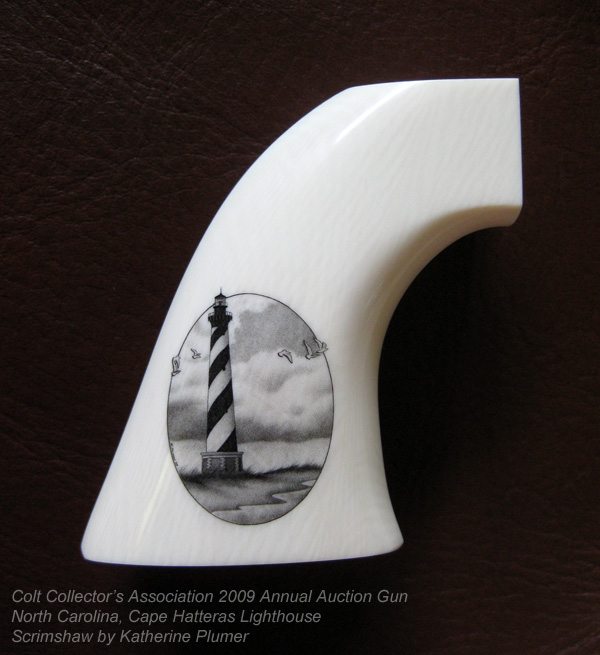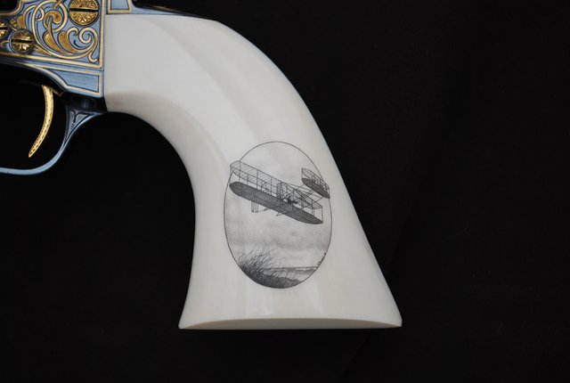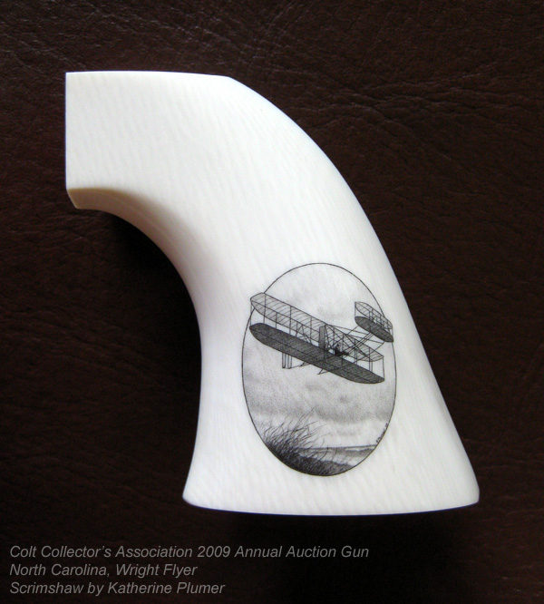 The theme of the CCA gun for 2009 was North Carolina. I was asked to scrim the Wright Flyer on one side and the Cape Hatteras Lighthouse on the other. The composition and design is entirely my own, and I had not seen any of the engraving until the entire project was completed. Words don't fully express what an honor it is to be asked to work on this project. Thank you Mike Dubber for the chance. :-)